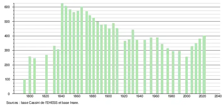 | L'évolution du nombre d'habitants est connue à travers les recensements de la population effectués dans la commune depuis 1793. Pour les communes de moins de 10 000 habitants, une enquête de recensement portant sur toute la population est réalisée tous les cinq ans, les populations de référence des années intermédiaires étant quant à elles estimées par interpolation ou extrapolation[22]. Pour la commune, le premier recensement exhaustif entrant dans le cadre du nouveau dispositif a été réalisé en 2006[23]. En 2022, la commune comptait 403 habitants[Note 3], en évolution de +6,05 % par rapport à 2016 (Lot-et-Garonne : −0,18 %, France hors Mayotte : +2,11 %). |