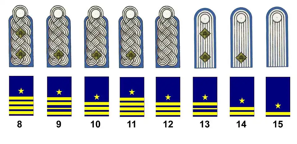 - Kommodore (« commodore », grade qui n'a pas d'équivalent dans certaines marines, comme dans le cas de la France)