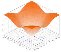 En mathématiques et en physique, le gradient d'une fonction de plusieurs variables est un champ de vecteurs qui combine en chaque point les différentes dérivées partielles et donne ainsi à la fois la direction de la variation la plus forte[1] localement et l’intensité de cette variation. Pour une fonction représentant l’altitude, il suit les lignes de plus grande pente (dans le sens de la montée), avec une norme égale à cette pente. Lorsque la fonction ne dépend que d’une seule variable réelle, le gradient se confond avec la dérivée usuelle, comme en météorologie où le gradient de température est assimilé au taux de variation de la température selon l'altitude[2].