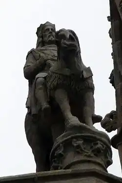 Le roi Gradlon : faïence polychrome de Quimper, manufacture HB, vers 1940 ; œuvre de François Cojan (1902-1945) exposée au musée de l'abbaye de Landévennec.- Arc de triomphe d'Argol : la statue du roi Gradlon.