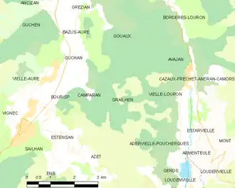 Les communes les plus proches[Note 1] sont[4] : Guchan (1,0 km), Camparan (1,1 km), Bazus-Aure (1,4 km), Gouaux (2,1 km), Grézian (2,7 km), Guchen (2,7 km), Bourisp (2,8 km), Estensan (3,4 km).