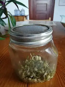 Les graines ayant besoin d'oxygène pour leur développement, il ne faut pas fermer les bocaux hermétiquement. La gaze (ou toile moustiquaire, ou dentelle, ou couvercle-passoire) permet un échange d'air tout en protégeant de la poussière, ou des poils et facilite les rinçages[1].