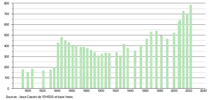 L'évolution du nombre d'habitants est connue à travers les recensements de la population effectués dans la commune depuis 1793. Pour les communes de moins de 10 000 habitants, une enquête de recensement portant sur toute la population est réalisée tous les cinq ans, les populations de référence des années intermédiaires étant quant à elles estimées par interpolation ou extrapolation[20]. Pour la commune, le premier recensement exhaustif entrant dans le cadre du nouveau dispositif a été réalisé en 2007[21].