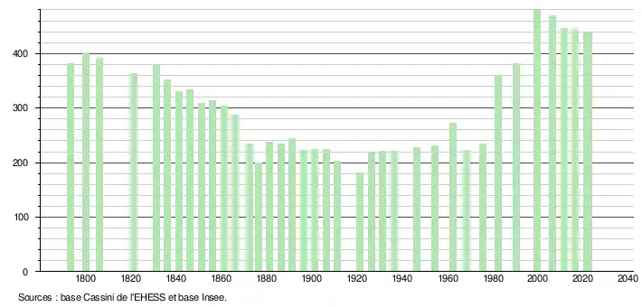 L'évolution du nombre d'habitants est connue à travers les recensements de la population effectués dans la commune depuis 1793. Pour les communes de moins de 10 000 habitants, une enquête de recensement portant sur toute la population est réalisée tous les cinq ans, les populations de référence des années intermédiaires étant quant à elles estimées par interpolation ou extrapolation[18]. Pour la commune, le premier recensement exhaustif entrant dans le cadre du nouveau dispositif a été réalisé en 2006[19].