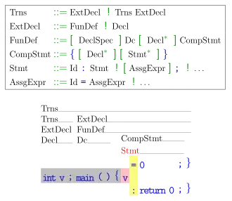int v ;main(){ " et qui concerne le choix d’une règle pour dériver le non-terminal " Stmt ". En regardant uniquement le premier jeton d'anticipation " v ", il ne peut pas choisir laquelle des deux alternatives pour " Stmt " choisir, étant donné que deux suites d'entrées sont possibles. Ils peuvent être distingués en jetant un coup d'œil sur le deuxième jeton d'anticipation (fond jaune). Dans la théorie des langages formels, une grammaire LL est une grammaire non contextuelle qui peut être analysée par un analyseur LL, c'est-à-dire qui analyse l'entrée de gauche à droite, et construit une dérivation gauche de la phrase (d'où LL: Left-to-right parsing with Leftmost derivation en anglais, par rapport à l'analyseur LR qui construit une dérivation droite, Rightmost derivation).