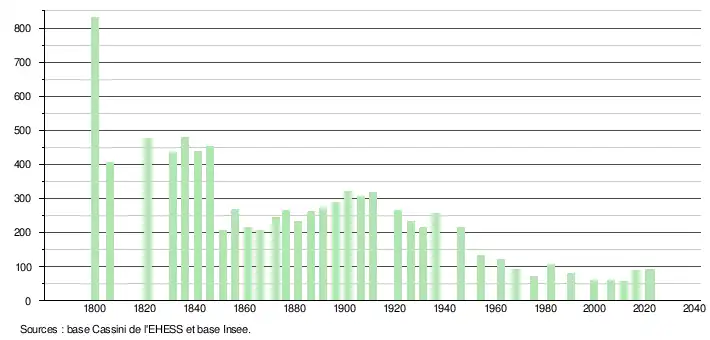 L'évolution du nombre d'habitants est connue à travers les recensements de la population effectués dans la commune depuis 1800. Pour les communes de moins de 10 000 habitants, une enquête de recensement portant sur toute la population est réalisée tous les cinq ans, les populations de référence des années intermédiaires étant quant à elles estimées par interpolation ou extrapolation[7]. Pour la commune, le premier recensement exhaustif entrant dans le cadre du nouveau dispositif a été réalisé en 2006[8].