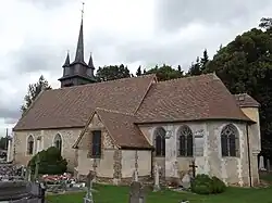 L'église Saint-Pierre[65] présente un gros œuvre en partie du XIIe siècle, des baies repercées au XVIe siècle, ainsi qu'un chœur et une nef reconstruits au XVIIIe siècle. À la suite d'un incendie dû à la foudre, une campagne de restauration générale fut entreprise en 1880 par l'architecte Ludovic Renou (Laigle 1833 - ap. 1906), architecte du département de l'Eure de 1866 à 1880, sous la houlette du maître d'œuvre Daniel Darcy (Cateau-Cambrésis - ), architecte diocésain d'Évreux depuis le . Dans le style néo-gothique flamboyant, ces derniers ajoutèrent des ouvertures de pierre et construisirent un nouveau clocher, inspiré de celui de l'église paroissiale Notre-Dame de la Couture à Bernay, depuis basilique.