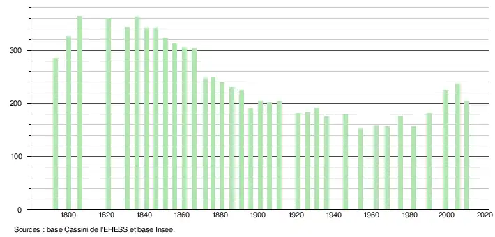 L'évolution du nombre d'habitants est connue à travers les recensements de la population effectués dans la commune depuis 1793. À partir du , les populations légales des communes sont publiées annuellement dans le cadre d'un recensement qui repose désormais sur une collecte d'information annuelle, concernant successivement tous les territoires communaux au cours d'une période de cinq ans. Pour les communes de moins de 10 000 habitants, une enquête de recensement portant sur toute la population est réalisée tous les cinq ans, les populations légales des années intermédiaires étant quant à elles estimées par interpolation ou extrapolation[58]. Pour la commune, le premier recensement exhaustif entrant dans le cadre du nouveau dispositif a été réalisé en 2005[59],[Note 1].