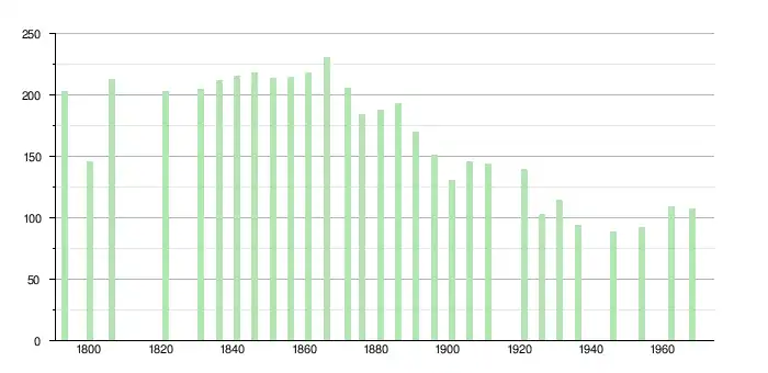 Le tableau et le graphique ci-dessous s'arrêtent à 1968, date du dernier recensement de Grand-Castang en tant que commune indépendante.