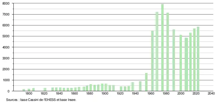 L'évolution du nombre d'habitants est connue à travers les recensements de la population effectués dans la commune depuis 1793. Pour les communes de moins de 10 000 habitants, une enquête de recensement portant sur toute la population est réalisée tous les cinq ans, les populations de référence des années intermédiaires étant quant à elles estimées par interpolation ou extrapolation[20]. Pour la commune, le premier recensement exhaustif entrant dans le cadre du nouveau dispositif a été réalisé en 2007[21].