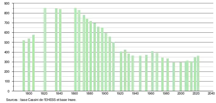 L'évolution du nombre d'habitants est connue à travers les recensements de la population effectués dans la commune depuis 1793. Pour les communes de moins de 10 000 habitants, une enquête de recensement portant sur toute la population est réalisée tous les cinq ans, les populations de référence des années intermédiaires étant quant à elles estimées par interpolation ou extrapolation[21]. Pour la commune, le premier recensement exhaustif entrant dans le cadre du nouveau dispositif a été réalisé en 2008[22].