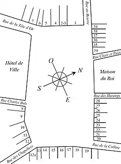 - ↑ Le long du tronçon actuellement nommé rue du Marché aux Herbes.