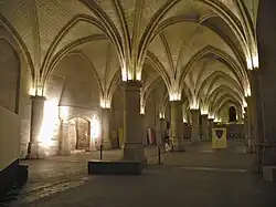 - Son organisation en deux vaisseaux parallèles sur deux niveaux dont seul subsiste le niveau inférieur, dénommé salle des Gens d’Armes ou salle Basse.