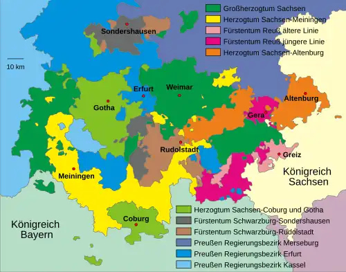 - ↑ Parfois aussi appelé grand-duché de Saxe-Weimar : en effet, au XIXe siècle, il y avait un royaume de Saxe, un grand-duché de Saxe (Saxe-Weimar), et trois duchés de Saxe (Saxe-Meiningen, Saxe-Altenbourg et Saxe-Cobourg-Gotha).