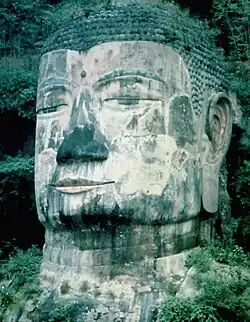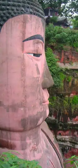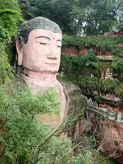 Le Grand Bouddha de Leshan, taillé dans la paroi rocheuse, mesure 71 mètres de haut, et 28 mètres de large aux épaules. La statue comporte un ingénieux système de drainage caché, qui a permis de limiter — mais non de supprimer — l'érosion naturelle[4].