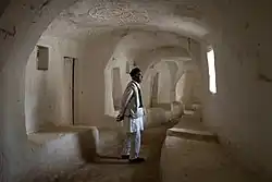 Le long de la bordure nord du Grand Erg oriental, l'écologie physique et la culture humaine survivant depuis des temps reculés forment un continuum. De Biskra en Algérie, à travers les Aurès, cette région s'étend à l'est jusqu'au Jérid tunisien. Il s'agit d'une zone de basse altitude parsemée de chotts et d'oasis occasionnelles, où on trouve une culture intensive de dizaines de milliers de palmiers-dattiers[14],[15]. Entre Biskra et le Jérid, mais un peu plus au sud, se trouve El Oued, une ville algérienne de taille moyenne (139 000 habitants), agrémentée de dômes et d'arches typiques de l'architecture saharienne. Cette oasis est située à environ 100 kilomètres à l'est de Touggourt, à la frontière nord de l'erg. La ville est alimentée en eau par une rivière souterraine.