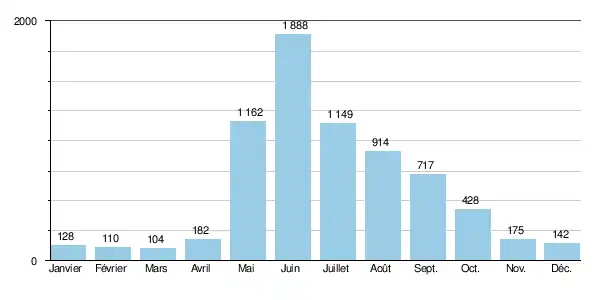 En ce qui concerne la période libre de glace (de juin à septembre inclus), le débit minimal observé a été de 307 m3/s en , ce qui restait cependant presque abondant.