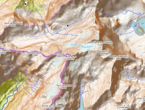 Ce sommet présente la particularité d'abriter sur ses pentes plusieurs glaciers assez imposants (dont certains s'étendent jusqu'à 2 500 m)  glacier du Ruan sur l'adret français, glacier des Fonds sur l'adret suisse et glacier du Mont Ruan sur l'ubac suisse[1] , et ce malgré son altitude limitée, dépassant de peu l'altitude moyenne de formation des neiges permanentes dites « éternelles » (environ 2 900 m dans les Alpes du Nord).