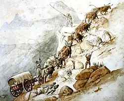 Les Voortrekkers voyagent à bord de chariots bâchés à double toit[12] de 4 m de long environ, de 1 m de large et au plancher situé à 1,7 m de hauteur sert de maison pour la mère et les enfants boers. Les 2 roues arrière du chariot sont plus grandes que les deux roues avant. Tous les ingrédients et l'équipement nécessaire pour la plupart des plats, ainsi que les meubles et les affaires personnels (draps) sont entassés dans le chariot. La Bible et les livres de cantiques, les vêtements, la vaisselle et les ustensiles de cuisine sont emballés dans les bancs situés à l'avant et à l'arrière du chariot. En dessous, sous le plancher, les outils tels que le sabot de frein, le cric, la fosse à goudron et les barils d'eau sont suspendus. L'ensemble du chariot est construit en planches ajustées, facilement démontables[12]. Enfin, ces chariots sont tirés par équipages de 12 à 16 chevaux du Cap ou par 4 à 8 paires de bœufs[12], plus résistants. La plupart des familles voortrekkers disposent d'un ou 2 chariot, bien que les plus riches en possède jusqu'à huit. En terrain plat, l'attelage peut ainsi parcourir 20 à 30 km par jour en 7 à 9 heures de routes[12].