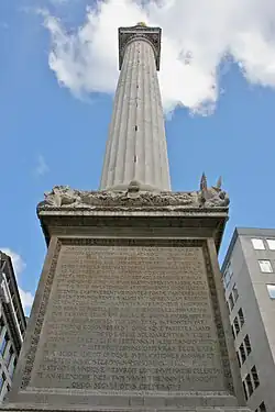 Un monument commémoratif du grand incendie, conçu à l’initiative de Charles II et dessiné par Christopher Wren et Robert Hooke, est érigé près de Pudding Lane. Haut de 61 mètres, « le Monument » est un point de repère célèbre à Londres, qui a donné son nom à une station de métro. En 1668, les accusations portées contre les catholiques sont gravées sur le Monument : « … le plus terrifiant Incendie de cette Cité ; allumé et perpétué par la traîtrise et la malveillance de la faction papiste » (« the most dreadful Burning of this City; begun and carried on by the treachery and malice of the Popish faction »). Cette inscription, brièvement effacée sous le règne de Jacques II (1685-1689), ne disparaît définitivement qu’en 1830[46].