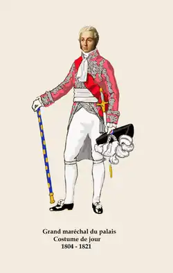 L'habit de cour de grand maréchal du palais suit la réglementation officielle. Il reprend la forme du petit costume, créé par Isabey et porté par l'empereur lors de son sacre le . Il est en velours de soie amarante avec des broderies argent. Ces obligations sont loin d'être gratuites puisque le titulaire est obligé de commander et de payer lui-même ses habits.