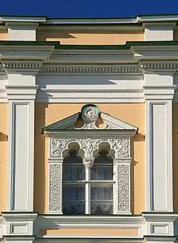 L'identité des rangées de piliers et de fenêtres à chambranles ciselés renforcent l'aspect monolithique de l'édifice. Bien que le palais ait deux niveaux, il présente trois rangées de fenêtres et portes, les salles du premier étage disposant d'une double rangée. Les baies de fenêtres sont l'élément principal du décor extérieur du palais. Les chambranles sont en pierre calcaire blanche comme les corniches. Elle est extraite des carrières de Miatchkovo, village des environs de Moscou. Elles sont surmontées d'arcs géminés à clef pendantes. C'est l'atelier moscovite de tailleurs de pierre Santino Campioni qui réalisa les fines ciselures, les figures d'animaux héraldiques, les motifs végétaux de ces décorations. Dans la composition du rez-de-chaussée l'architecte Thon utilise le motif de l'arcade, élément caractéristique du palais des grands-princes de Moscou aux XVe siècle au XVIIe siècle. Ces éléments de la façade monumentale et plate lui donnent un caractère de mosaïque[4].