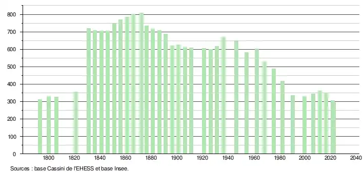 L'évolution du nombre d'habitants est connue à travers les recensements de la population effectués dans la commune depuis 1793. Pour les communes de moins de 10 000 habitants, une enquête de recensement portant sur toute la population est réalisée tous les cinq ans, les populations de référence des années intermédiaires étant quant à elles estimées par interpolation ou extrapolation[26]. Pour la commune, le premier recensement exhaustif entrant dans le cadre du nouveau dispositif a été réalisé en 2006[27].