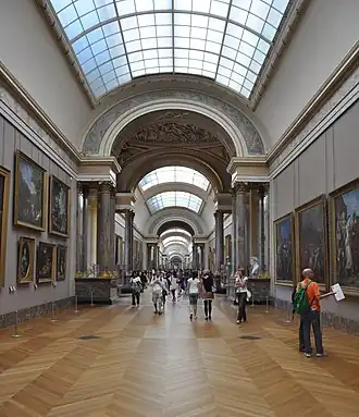 Espace de réception, la galerie haute a abrité, tout au long du XVIIIe siècle, la collection royale de plans-reliefs des villes fortifiées. L’idée d’installer les collections royales dans la Grande Galerie du Louvre, siège de l’Académie royale de peinture et de sculpture, prit corps dans la seconde moitié du XVIIIe siècle. L’action du directeur général des Bâtiments du Roi, le comte d’Angiviller, et la création en 1784 d’un comité chargé d’organiser les collections permirent de faire avancer le projet. Les premiers tableaux y sont déposés depuis Versailles en 1785[6]. Mis en sommeil pendant la tourmente révolutionnaire, la confusion des biens de la Couronne avec ceux de la nation et la nécessité d’instruire le peuple rendirent cependant urgente sa création, qui eut lieu en pleine Révolution, la Grande Galerie ouvrant au public le 10 août 1793.