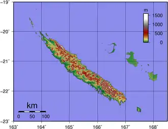 L'île est séparée en deux sur pratiquement toute sa longueur par un arc montagneux ancien (contenant des éléments géologiques antérieurs au Permien mais difficilement identifiables) et relativement peu élevé (le point culminant est le mont Panié, au nord, qui s'élève à 1 629 m, suivi de peu par le mont Humboldt au sud, avec 1 618 m) : la Chaîne centrale, plus généralement appelée simplement la « Chaîne », véritable épine dorsale de la Grande Terre. Son axe étant légèrement excentré vers l'est de l'île, la côte est se retrouve limitée à une étroite bande littorale, les montagnes tombant souvent de manières abruptes directement dans la mer, et à plusieurs vallées encaissées, tandis que le relief de la côte ouest s'échelonne par paliers d'altitudes décroissantes avec un réseau de plateaux, de collines et de vastes plaines.