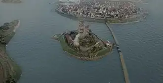 Maquette numérique panoramique du château de Vyborg brulant après l'attaque Russe de 1710.