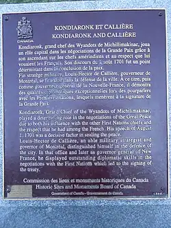 Plaque rendant hommage à Kondiaronk et Callière, sur la Place de la Grande-Paix-de-Montréal.