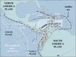 L'origine pacifique de la grande province ignée caribéenne est prouvée, attestée par les fragments de croûte océanique accrétés aux marges de la plaque caraïbe, par exemple sur Hispaniola et Porto Rico, lesquels contiennent des fossiles de la faune venant du Pacifique[10]. Le transit vers l'Est de la plaque Farallon a poussé la moitié nord de la grande province ignée caribéenne dans le bassin océanique en cours d'ouverture entre les plaques nord et sud-américaines au début du Jurassique. Néanmoins, le mécanisme qui a poussé la grande province ignée caribéenne vers le nord-est demeure obscur, surtout si l'on considère la subduction de l'arc Costa Rica-Panama au cours du Campanien, il y a entre 83 et 72 millions d'années. Le point chaud des Galápagos est sans doute à l'origine du deuxième épisode émissif, tandis que le troisième, comme ce qui a causé une reprise temporaire de l'activité il y a 55 millions d'années, tire son origine d'un amincissement lithosphérique dans la Caraïbe centrale[10].