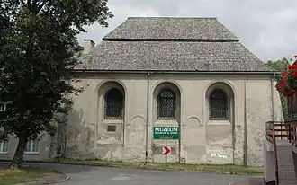 Le bâtiment est orienté avec l'entrée dans la direction de l'ouest et l'Arche Sainte sur le mur opposé, vers l'est (direction de Jérusalem). Les fenêtres sont situées au fond d'alcôves à arcade, au niveau de la galerie des femmes, au premier étage et sont à arc plein cintre: trois sur chacun des murs sud et nord et deux sur le mur est. Sur le mur est, au-dessus de l'Arche Sainte, entre les deux fenêtres a été percé un petit oculus. L'édifice est couvert d'un toit en bardeaux, à quatre versants. Le toit dans sa forme actuelle a été créé lors de la rénovation dans les années 1950 et imite le toit de synagogues semblables datant du XVIIIe siècle. Selon des relevés effectués après la guerre, la synagogue possédait un toit à croupettes, probablement, lié avec la construction du plafond en bois de la salle principale.