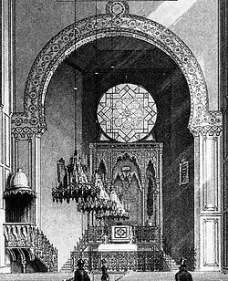 Du côté est de la nef sont regroupés la chaire et dans l'abside, la bimah et l'Aron Kodesh (l'Arche sainte). La chaire de la synagogue est comparable à la chaire d'une église chrétienne, avec pour décor des stalactites mais est couronnée d'une coupole de style islamique telle que l'on trouve sur les minbars des mosquées[5]. La bimah est située derrière une grille et derrière celle-ci un pupitre de lecture surélevé. De chaque côté de la grille, des marches conduisent à l'Arche sainte. L'Arche est divisée symétriquement en trois parties, avec une large partie centrale, et des parties latérales plus étroites[6].