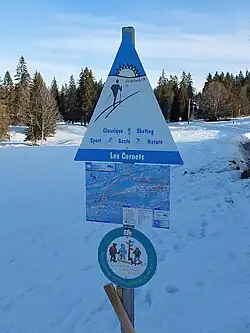 La TJS une sorte de GTJ en Suisse CAF a été retracée et balisée en 2012[2], Les Cernets, panneau de la « Romandie Ski de Fond » rappelant le respect des traces de ski.