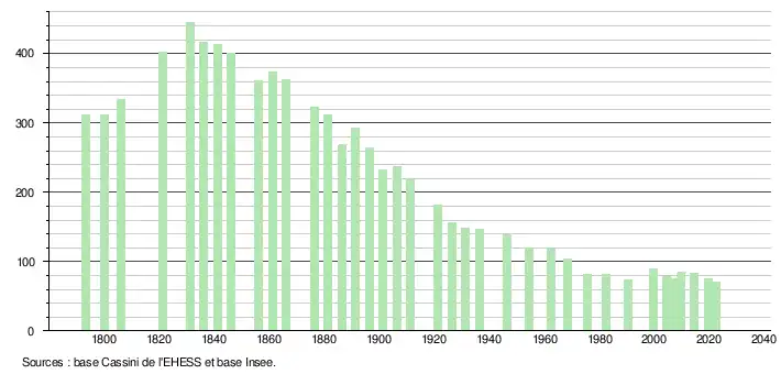 L'évolution du nombre d'habitants est connue à travers les recensements de la population effectués dans la commune depuis 1793. Pour les communes de moins de 10 000 habitants, une enquête de recensement portant sur toute la population est réalisée tous les cinq ans, les populations de référence des années intermédiaires étant quant à elles estimées par interpolation ou extrapolation[18]. Pour la commune, le premier recensement exhaustif entrant dans le cadre du nouveau dispositif a été réalisé en 2004[19].