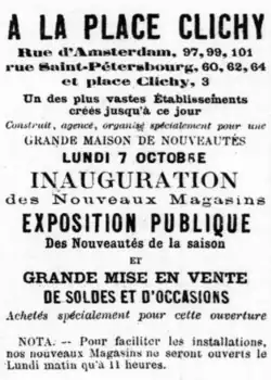 En 1865, sont fondés au 97 rue d'Amsterdam les « Magasins de nouveautés de la place Clichy », l'année même de la fin des travaux haussmanniens qui avaient transformés le quartier[1]. En 1868, les magasins s'étendent au numéro 95 de la même rue. Le 7 octobre 1872, après les destructions causées durant le siège de Paris, les magasins sont rouverts, totalement rénovés[2].