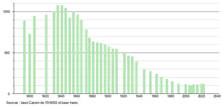 L'évolution du nombre d'habitants est connue à travers les recensements de la population effectués dans la commune depuis 1793. Pour les communes de moins de 10 000 habitants, une enquête de recensement portant sur toute la population est réalisée tous les cinq ans, les populations de référence des années intermédiaires étant quant à elles estimées par interpolation ou extrapolation[15]. Pour la commune, le premier recensement exhaustif entrant dans le cadre du nouveau dispositif a été réalisé en 2004[16].