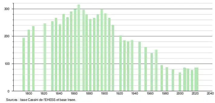 L'évolution du nombre d'habitants est connue à travers les recensements de la population effectués dans la commune depuis 1793. Pour les communes de moins de 10 000 habitants, une enquête de recensement portant sur toute la population est réalisée tous les cinq ans, les populations de référence des années intermédiaires étant quant à elles estimées par interpolation ou extrapolation[13]. Pour la commune, le premier recensement exhaustif entrant dans le cadre du nouveau dispositif a été réalisé en 2005[14].