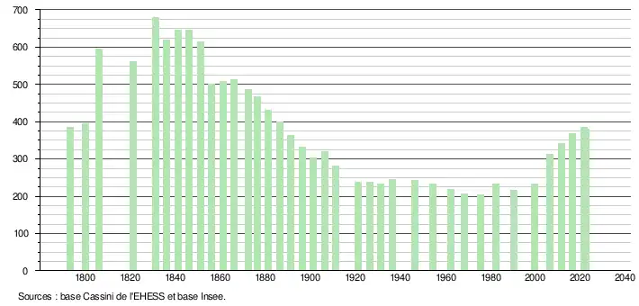 L'évolution du nombre d'habitants est connue à travers les recensements de la population effectués dans la commune depuis 1793. Pour les communes de moins de 10 000 habitants, une enquête de recensement portant sur toute la population est réalisée tous les cinq ans, les populations de référence des années intermédiaires étant quant à elles estimées par interpolation ou extrapolation[18]. Pour la commune, le premier recensement exhaustif entrant dans le cadre du nouveau dispositif a été réalisé en 2006[19].