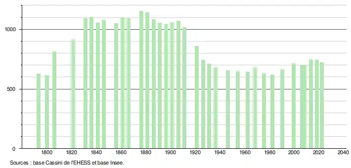 L'évolution du nombre d'habitants est connue à travers les recensements de la population effectués dans la commune depuis 1793. Pour les communes de moins de 10 000 habitants, une enquête de recensement portant sur toute la population est réalisée tous les cinq ans, les populations de référence des années intermédiaires étant quant à elles estimées par interpolation ou extrapolation[28]. Pour la commune, le premier recensement exhaustif entrant dans le cadre du nouveau dispositif a été réalisé en 2008[29].