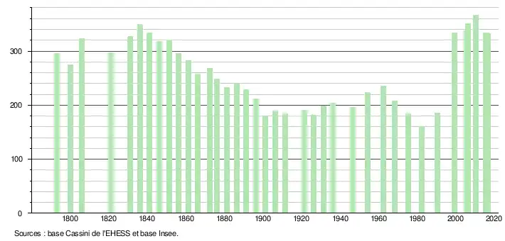 L'évolution du nombre d'habitants est connue à travers les recensements de la population effectués dans la commune depuis 1793. Pour les communes de moins de 10 000 habitants, une enquête de recensement portant sur toute la population est réalisée tous les cinq ans, les populations de référence des années intermédiaires étant quant à elles estimées par interpolation ou extrapolation[7]. Pour la commune, le premier recensement exhaustif entrant dans le cadre du nouveau dispositif a été réalisé en 2005[8].