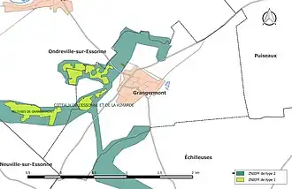 La ZNIEFF, de deuxième génération et de type 2[Note 2], dénommée « Coteaux de l'Essonne et de la Rimarde », d'une superficie de 1 812 hectares, s'étend sur 17 communes, dont Grangermont est située sur la frange nord-ouest de la ZNIEFF correspondant à la partie est de la commune[22]. Son altitude varie entre 90 et 140 m[23]. Les coteaux de l'Essonne et de la Rimarde sont un des espaces les plus intéressants du Loiret sur le plan biologique et écologique et géologique, tant pour les habitats naturels et les espèces d'intérêt patrimonial qu'ils abritent que pour le rôle fonctionnel qu'ils jouent. Les éléments singuliers et typiques de la flore sont notamment l'aster amelle (station très localisée), le carex de Haller, le lin de Léon, la violette des rochers ou encore le petit pigamon[24].