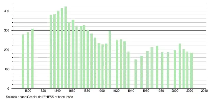 L'évolution du nombre d'habitants est connue à travers les recensements de la population effectués dans la commune depuis 1793. Pour les communes de moins de 10 000 habitants, une enquête de recensement portant sur toute la population est réalisée tous les cinq ans, les populations de référence des années intermédiaires étant quant à elles estimées par interpolation ou extrapolation[19]. Pour la commune, le premier recensement exhaustif entrant dans le cadre du nouveau dispositif a été réalisé en 2006[20].