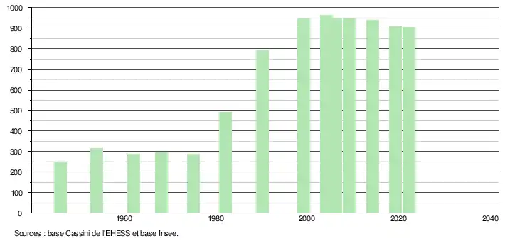 L'évolution du nombre d'habitants est connue à travers les recensements de la population effectués dans la commune depuis 1946. Pour les communes de moins de 10 000 habitants, une enquête de recensement portant sur toute la population est réalisée tous les cinq ans, les populations de référence des années intermédiaires étant quant à elles estimées par interpolation ou extrapolation[18]. Pour la commune, le premier recensement exhaustif entrant dans le cadre du nouveau dispositif a été réalisé en 2004[19].