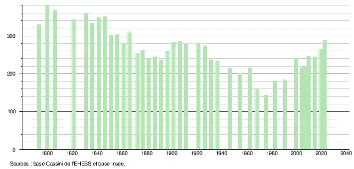 L'évolution du nombre d'habitants est connue à travers les recensements de la population effectués dans la commune depuis 1793. Pour les communes de moins de 10 000 habitants, une enquête de recensement portant sur toute la population est réalisée tous les cinq ans, les populations de référence des années intermédiaires étant quant à elles estimées par interpolation ou extrapolation[33]. Pour la commune, le premier recensement exhaustif entrant dans le cadre du nouveau dispositif a été réalisé en 2004[34].