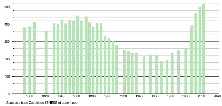 L'évolution du nombre d'habitants est connue à travers les recensements de la population effectués dans la commune depuis 1793. Pour les communes de moins de 10 000 habitants, une enquête de recensement portant sur toute la population est réalisée tous les cinq ans, les populations de référence des années intermédiaires étant quant à elles estimées par interpolation ou extrapolation[20]. Pour la commune, le premier recensement exhaustif entrant dans le cadre du nouveau dispositif a été réalisé en 2007[21].