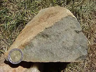 Le faciès à gros grains, qui est le faciès commun, occupe la plus grande surface. Les grains ont des tailles généralement de 2 et 6 millimètres et restent grossièrement isométriques. La roche intacte a une couleur grise ; les affleurements altérés peuvent prendre une coloration brunâtre-rougeâtre. Il comprend les minéraux suivants :