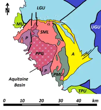 - Unité micaschiste parautochtone (unité bo) renfermant le leucogranite de Saint-Mathieu (PMU)