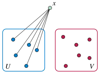 x est par construction plus grand que tous les éléments de U et de V, adjacent à tous les éléments de U, et puisque U et V sont disjoints, x n'est adjacent à aucun élément de V[a].